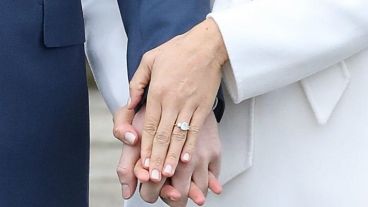 Meghan dijo estar "muy feliz", mientras lucía la alianza que le regaló su prometido, diseñada por el propio príncipe e integrada por tres diamantes, dos de ellos pertenecientes a Lady Di.
