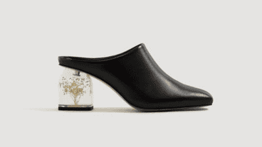 En Mango existe otra opción, igual de ideal. En este caso se trata de unos zuecos negros de piel que llevan dentro del taco unas flores secas.