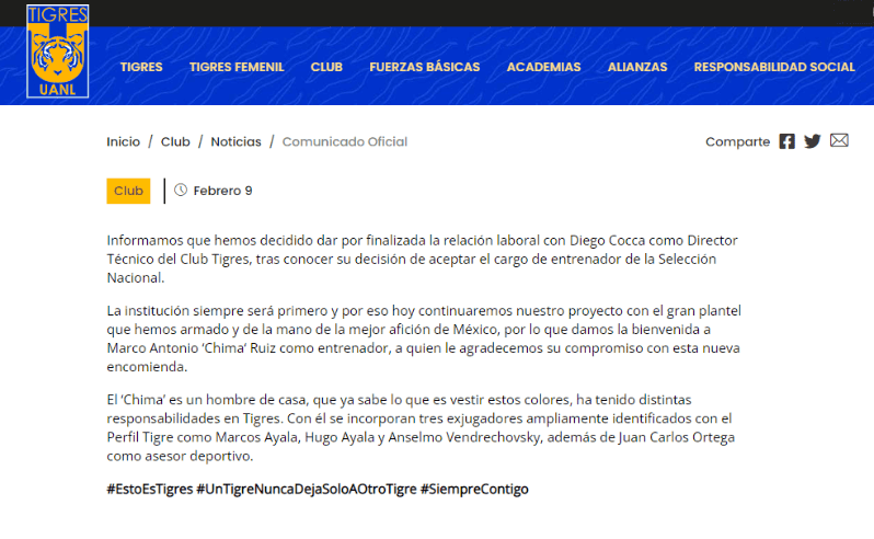 Diego Cocca confirmó su salida de Tigres y quedó a un paso de convertirse en nuevo entrenador de la selección de México. Luego del fin de ciclo de Gerardo "Tata" Martino, tras quedar eliminado en fase de grupo del Mundial de Qatar 2022, la dirigencia azteca decidió volver a confiar en otro argentino.