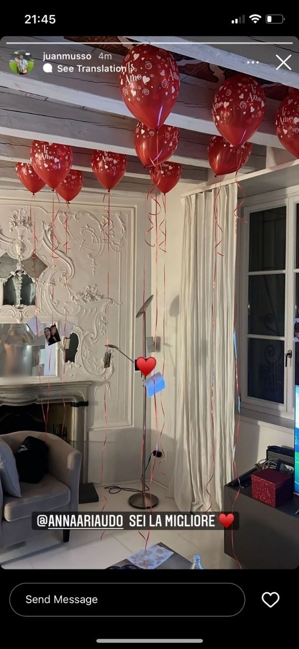 En la primera imagen, el arquero había escrito "Sei la migliore" (eres la mejor) para su pareja, y a la vista había unos globos en forma de corazón, flores y chocolates.