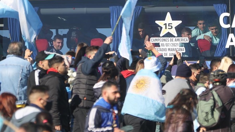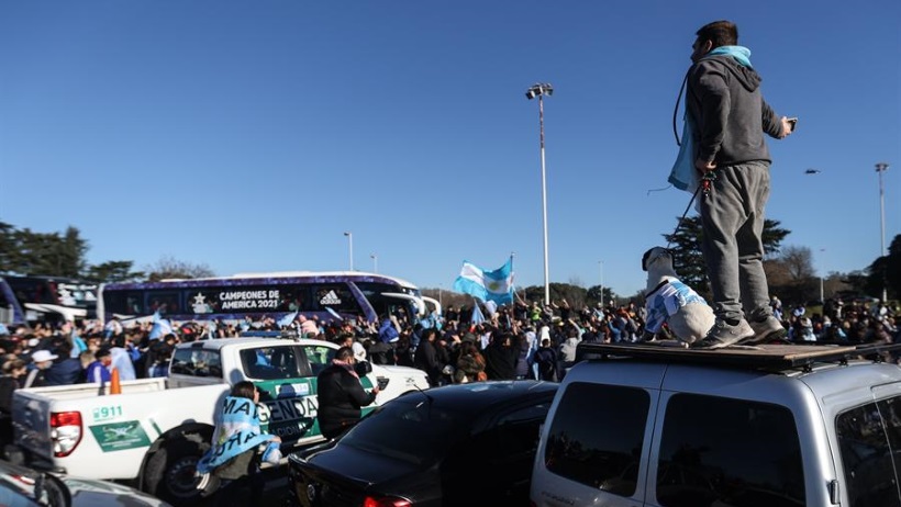 La selección argentina arribó este domingo pasadas las diez al predio que la AFA tiene en Ezeiza luego de aterrizar en el aeropuerto a las 8.43. Al grito de “dale campeón” un cordón de hinchas acompañó el traslado del equipo ganador de la Copa América 2021.