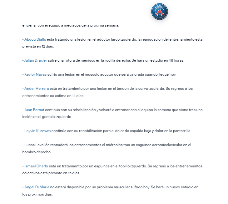 "Ángel Di María no estará disponible por un problema muscular sentido hoy. Se hará un nuevo punto en los próximos días", anunció el club parisino en un comunicado.