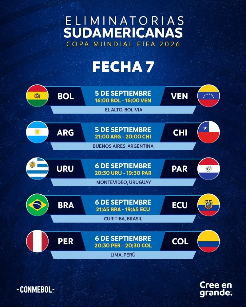 El otro encuentro de Argentina será contra Colombia el martes 10 de septiembre a las 17.30 en Barranquilla, por la octava fecha de Eliminatorias.