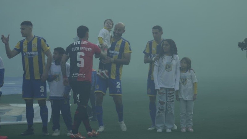 Cinco minutos antes de la hora pactada para el comienzo del clásico rosarino, los equipos de Central y Newell's salieron por el túnel del Gigante de Arroyito hacia la cancha, con cerca de 50 mil almas canallas que le dieron un marco realmente impactante e impresionante al partido.