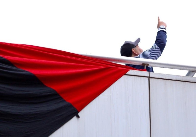 A partir de las 4 de la tarde, un ruidoso grupo de hinchas se agolpó cerca de la puerta del hotel, con banderas rojinegras, bombos y trompetas.