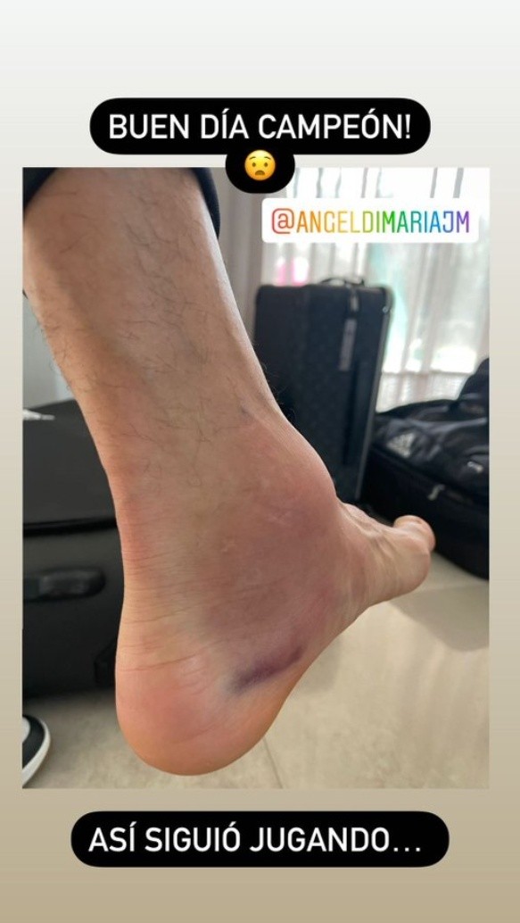 "Así siguió jugando", dice la imagen que compartió Jorgelina Cardoso en su cuenta de Instagram sobre el tobillo de Ángel Di María. La lesión fue cuando el autor del único tanto ante Brasil, cayó solo y paralizó los corazones argentinos.