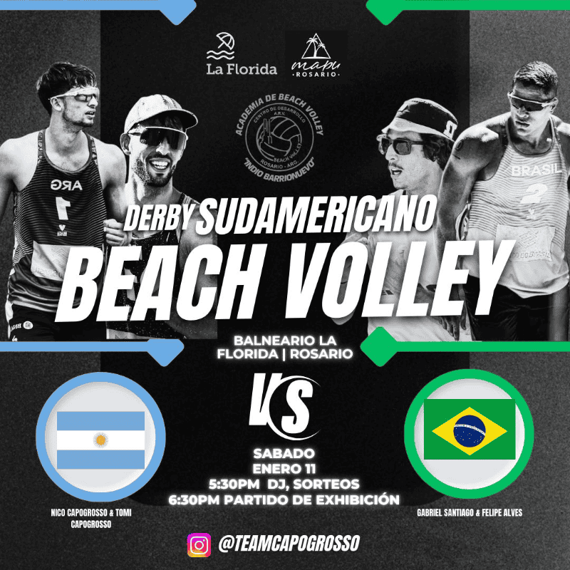 El balneario La Florida será escenario este sábado de un match Internacional de Beach Volley, cuando a partir de las 18.30 se enfrenten la dupla rosarina compuesta por Nicolás y Tomás Capogrosso ante la pareja brasileña integrada por Gabriel Santiago y Felipe Alves.