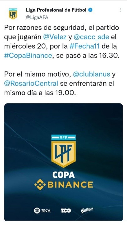 La Liga expresó que se vio obligada a modificar el horario del juego entre Vélez y Central Córdoba de Santiago del Estero por razones de seguridad y eso empujó que también cambiara el horario del juego del conjunto de Arroyito.