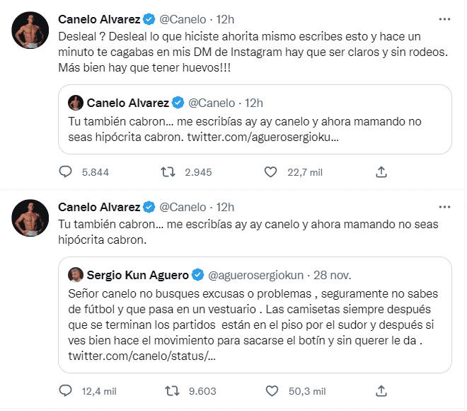 Sin embargo, al retomar sus redes sociales un día después, Canelo Álvarez le respondió al Kun Agüero, y no lo hizo en un tono conciliador. Por el contrario, lo tildó de hipócrita: “Tu también cabrón… me escribías ay ay Canelo y ahora mamando no seas hipócrita cabron”.