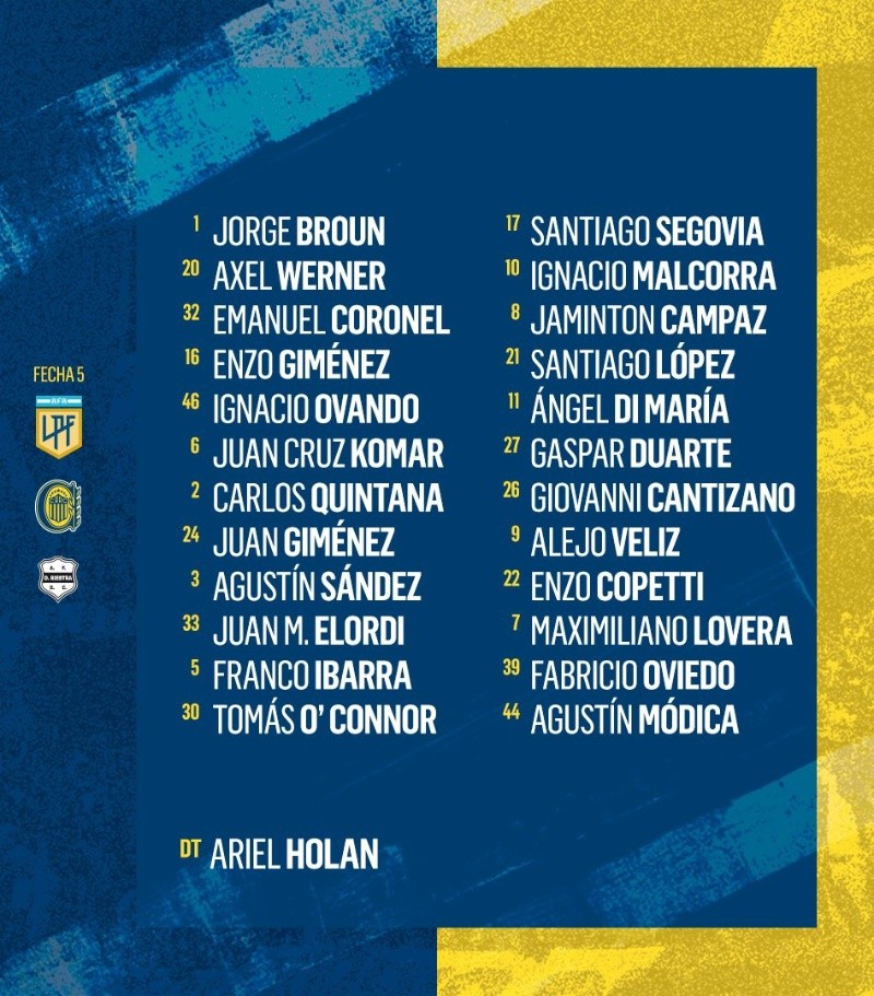 Los once nombres y apellidos que integraron el equipo titular fueron: Jorge Broun; Enzo Giménez, Juan Cruz Komar, Carlos Quintana, Agustín Sández; Ángel Di María, Franco Ibarra, Ignacio Malcorra, Jaminton Campaz; Enzo Copetti y Alejo Veliz.