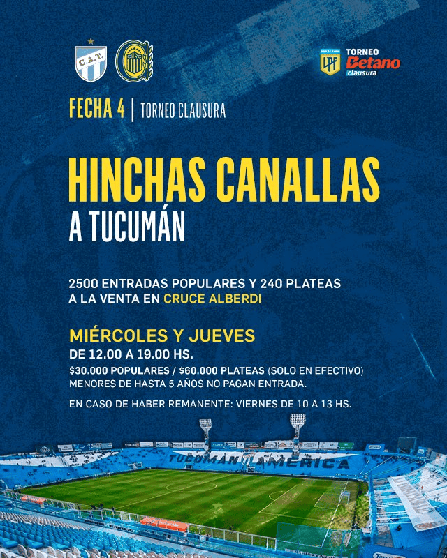 Los hinchas de Central vuelven a las rutas el próximo fin de semana, cuando el equipo canalla enfrente el sábado desde las 20.45 a Atlético Tucumán por la fecha 4 del torneo Clausura 2025. La venta de tickets comenzó este miércoles, siguió a buen ritmo y continuará este viernes desde las 10 y hasta el mediodía en la sede de Cruce Alberdi. Es solo de manera presencial y con pago en efectivo: 30 mil pesos la popular y 60 mil la platea.
