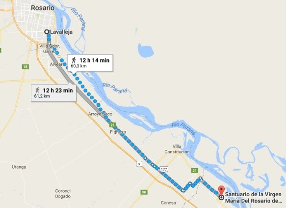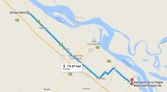 En cambio, si Messi sale desde Arroyo Seco, la distancia sería mucho menor, 39 kilómetros, que tardaría 8 horas en recorrer caminando.