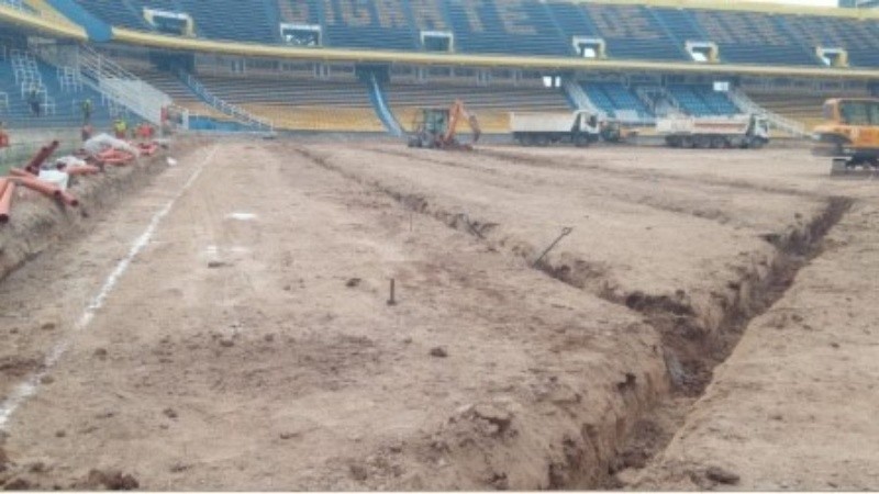 Respecto del campo de juego, comenzaron las tareas perfilado final con los niveles proyectados y se comenzó con las excavaciones del drenaje previsto. En tanto, se encuentra en obra la cañería de drenaje y acopiada en obrador de Edeca S.A., la totalidad de la piedra 6-20 y 3-9 para la primera capa de campo de juego. Luego iniciaron el acopio en obra de la arena y turba.
