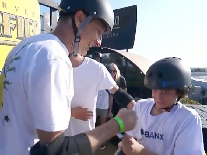 El niño se ganó el aplauso y el reconocimiento de los otros competidores durante la última jornada del certamen de deportes extremos, incluido el del propio Hawk.