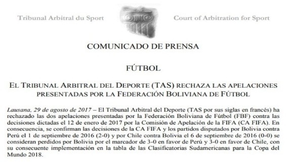 El Tribunal Arbitral del Deporte no modificó su decisión, de manera que le dio por perdido dos partidos a la selección de Bolivia por incluir mal a un jugador. Se trata del mediocampista Nelson Cabrera, quien nació en Paraguay y no cumplía con los plazos necesarios para representar a la Selección.