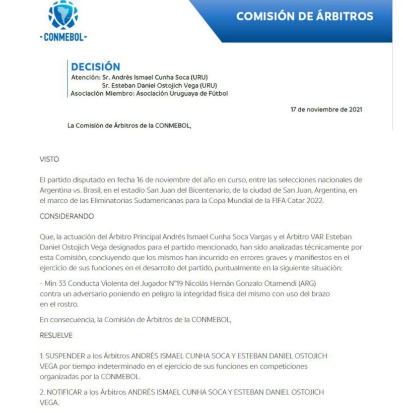 “La actuación del Árbitro Principal Andrés Ismael Cunha Soca Vargas y el Árbitro VAR Esteban Daniel Ostojich Vega designados para el partido mencionado, han sido analizadas técnicamente por esta Comisión, concluyendo que los mismos han incurrido en errores graves y manifiestos en el ejercicio de sus funciones en el desarrollo del partido, puntualmente en la siguiente situación: - Min 33 Conducta Violenta del Jugador N°19 Nicolás Hernán Gonzalo Otamendi (ARG) contra un adversario poniendo en peligro la integridad física del mismo con uso del brazo en el rostro”, advirtió la Conmebol.