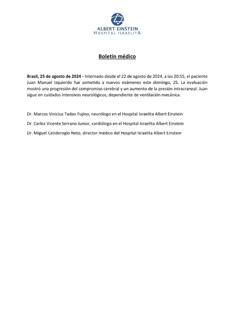 “Internado desde el 22 de agosto de 2024, a las 20:55, el paciente Juan Manuel Izquierdo fue sometido a nuevos exámenes este domingo, 25. La evaluación mostró una progresión cerebral y un aumento de la presión intracraneal. Juan sigue en cuidados intensivos, neurológicos, dependiente de ventilación mecánica”, reza el parte médico, junto a las firmas del neurólogo, cardiólogo y el director médico del Hostipal Israelita Albert Einstein.