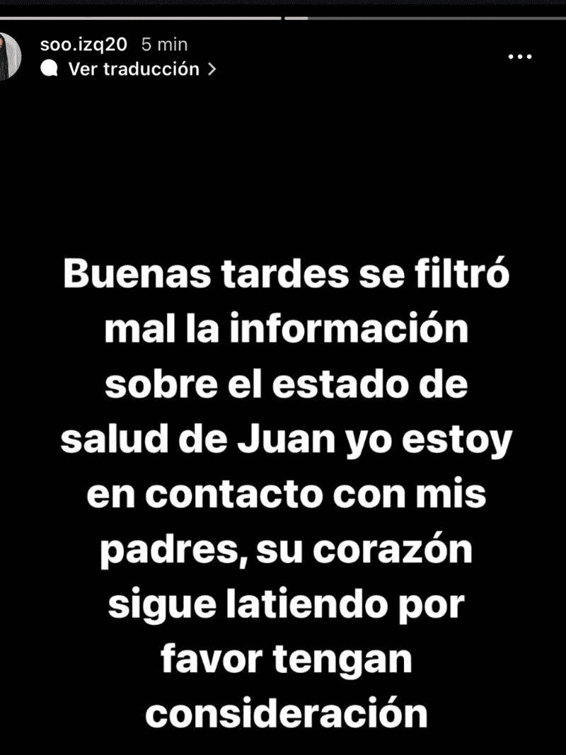 Sofía Izquierdo, hermana del defensor central, hizo un llamado a través de su cuenta de Instagram para que se deje de difundir datos falsos. “Buenas tardes, se filtró mal la información sobre el estado de salud de Juan. Yo estoy en contacto con mis padres. Su corazón sigue latiendo, por favor tengan consideración”, expresó en una publicación en la red social.