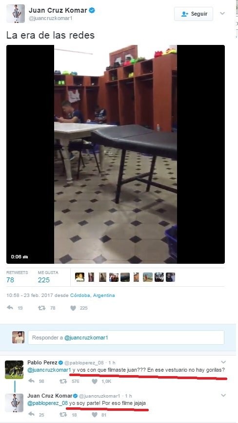 Luego de eso, Pablo Pérez le comentó la publicación: "¿Y vos con qué filmaste Juan? ¿En ese vestuario también hay gorilas?". En seguida, Komar le respondió: "¡Yo soy parte! Por eso filmé jaja", concluyó el defensor.
