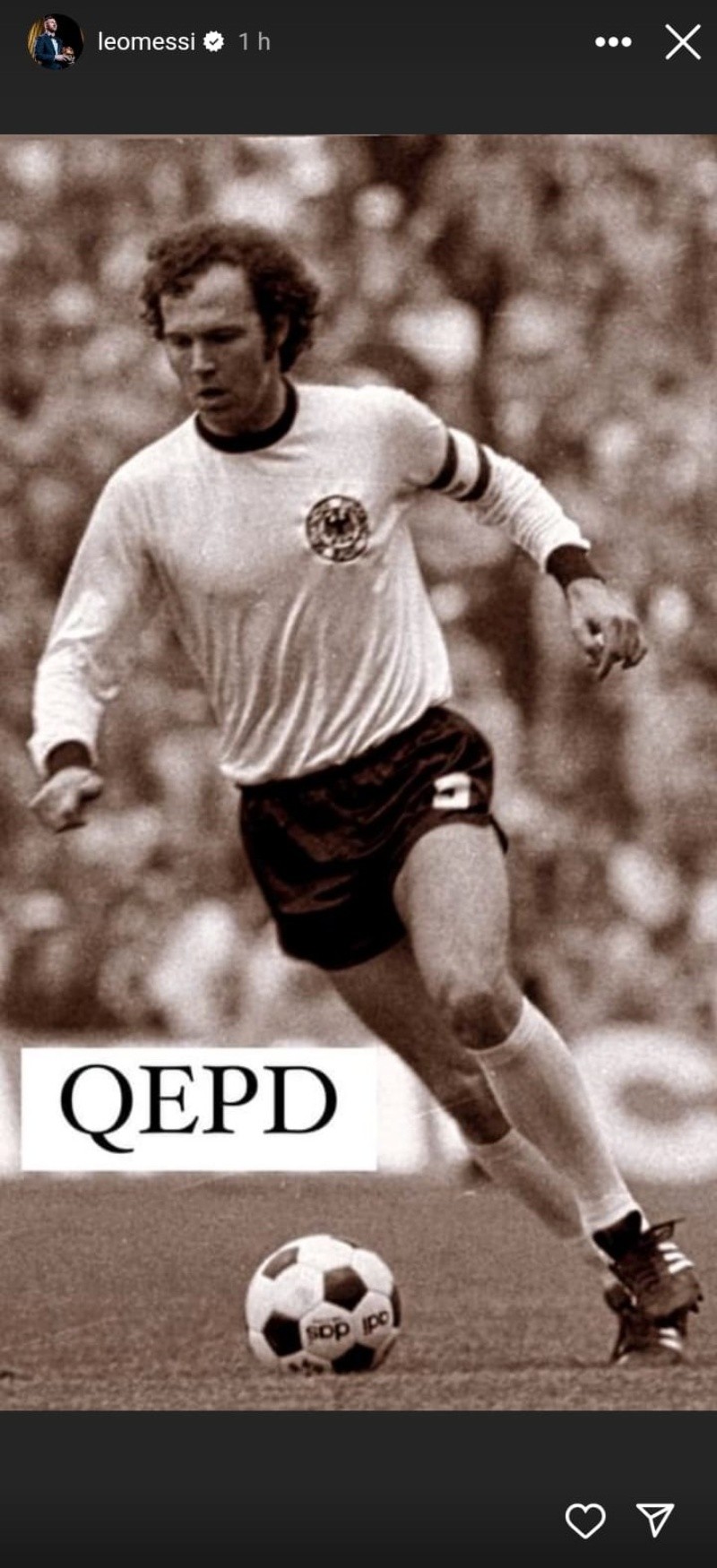 El astro rosarino Lionel Messi despidió al legendario defensor alemán Franz Beckenbauer, fallecido este domingo, mediante la red social Instagram, en la que publicó una imagen del Kaiser cuando era jugador.