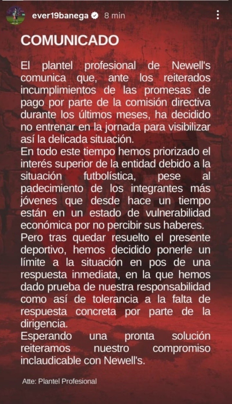 Este martes se había hecho público un mensaje en las redes sociales del capitán Ever banega, en el que se daba cuenta de la situación: "En todo este tiempo hemos priorizado el interés superior de la entidad debido a la situación futbolística, pese al padecimiento de los integrantes más jóvenes que desde hace un tiempo están en un estado de vulnerabilidad económica por no percibir sus haberes", decía el comunicado.