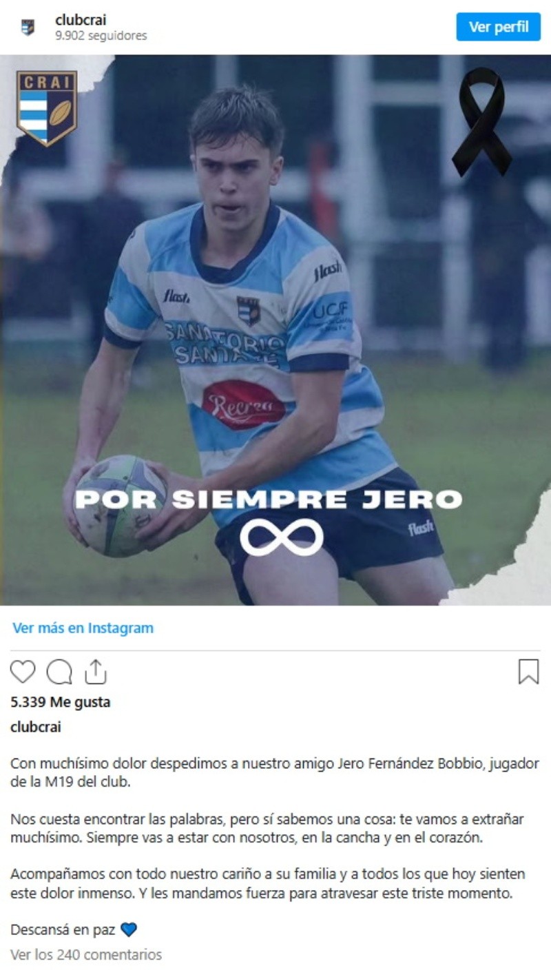 El rugby de la capital santafesina atraviesa un durísimo momento, a causa de la muerte del joven deportista Jerónimo Fernández Bobbio, de 18 años, jugador del Club de Rugby Ateneo Inmaculada (CRAI).