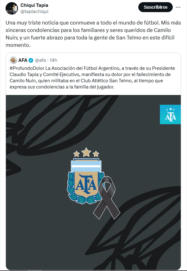 Por otro lado, el presidente de la Asociación de Fútbol Argentino (AFA) Claudio Chiqui Tapia se expresó en sus redes por el caso: "Una muy triste noticia que conmueve a todo el mundo de fútbol. Mis más sinceras condolencias para los familiares y seres queridos de Camilo Nuin; y un fuerte abrazo para toda la gente de San Telmo en este difícil momento".