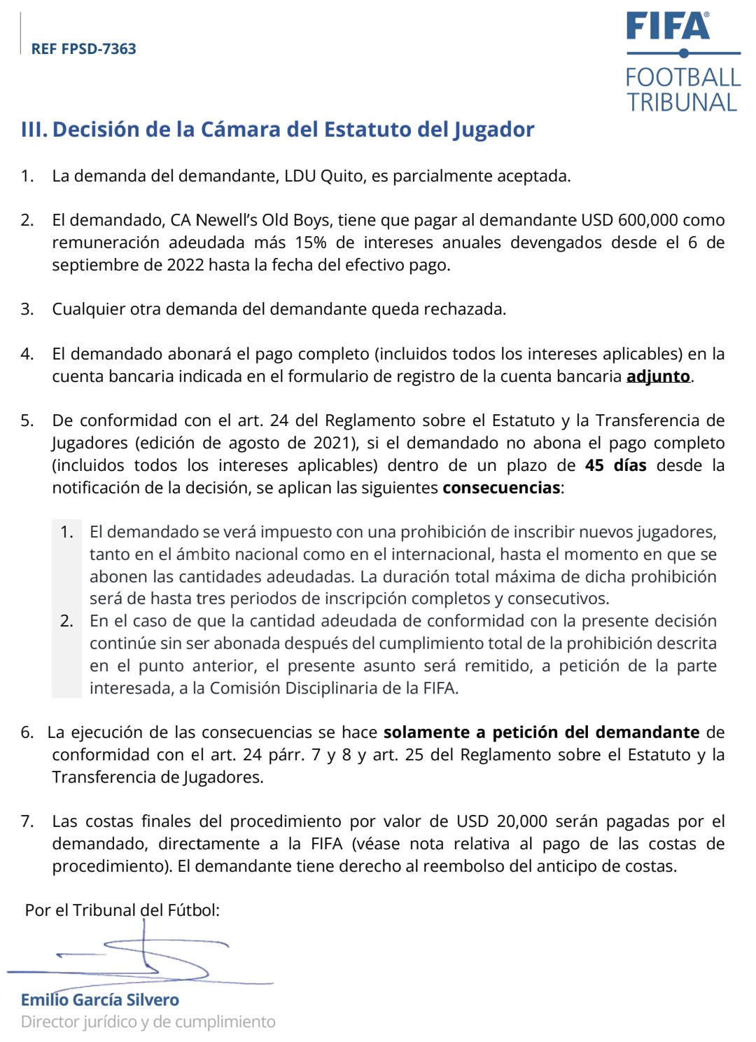 "El demandado, Newell's Old Boys, tiene que pagar al demandante, USD 600.000 como remuneración adeudada, más 15% de intereses anuales devengados desde el 6 de septiembre de 2022 hasta la fecha del efectivo pago", dice el comunicado oficial.