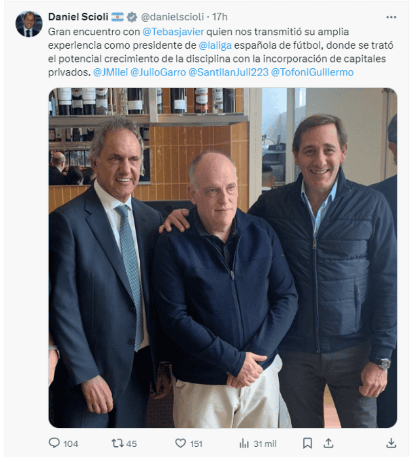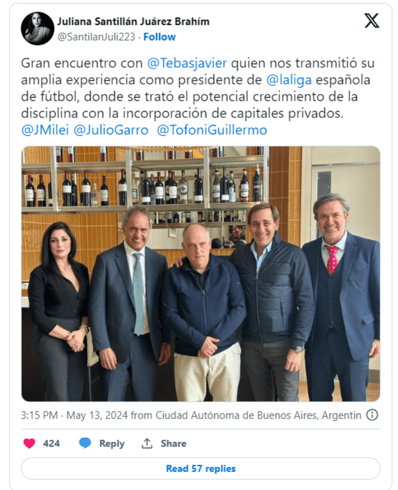 Tebas es uno de los impulsores de las Sociedades Anónimas Deportivas en todo el mundo y tiene una gran relación con Mauricio Macri, quien fuera el principal impulsor de este tipo de sociedades en el fútbol argentino. La búsqueda de la privatización del fútbol argentino se dio desde el primer momento a través de la dupla de empresarios. En esta oportunidad, el empresario español se reunió con parte del gobierno de La Libertad Avanza que dirige Javier Milei y que tiene especial interés en este modelo.