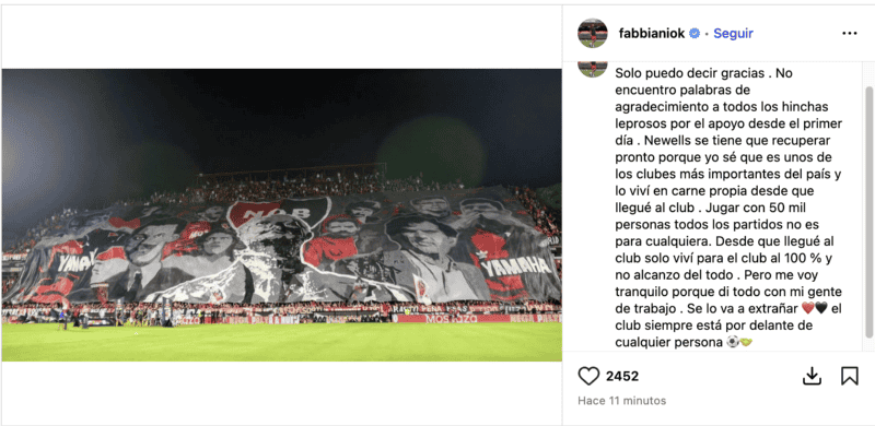 "Solo puedo decir gracias. No encuentro palabras de agradecimiento a todos los hinchas leprosos por el apoyo desde el primer día. Newell's se tiene que recuperar pronto porque yo sé que es unos de los clubes más importantes del país y lo viví en carne propia desde que llegué al club. Jugar con 50 mil personas todos los partidos no es para cualquiera. Desde que llegué al club solo viví para el club al 100 % y no alcanzo del todo. Pero me voy tranquilo porque di todo con mi gente de trabajo. Se lo va a extrañar el club siempre está por delante de cualquier persona", escribió con emojis rojinegros.
