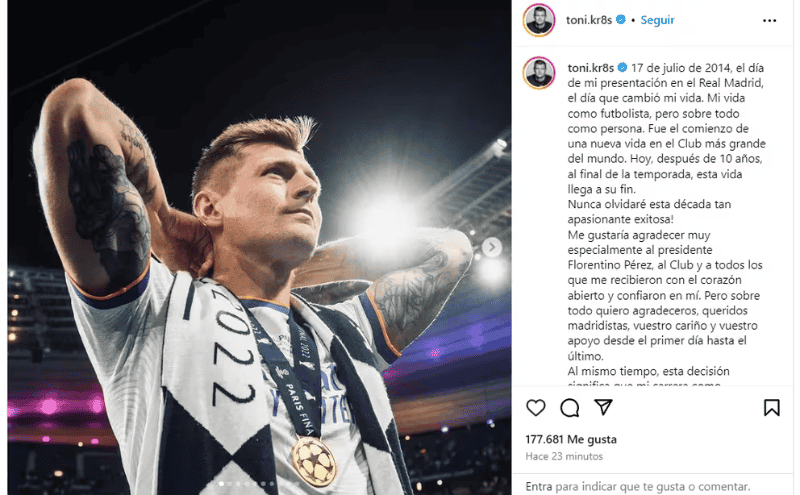 “17 de julio de 2014, el día de mi presentación en el Real Madrid, el día que cambió mi vida. Mi vida como futbolista, pero sobre todo como persona. Fue el comienzo de una nueva vida en el Club más grande del mundo. Hoy, después de 10 años, al final de la temporada, esta vida llega a su fin”, fueron las primeras palabras de Toni.