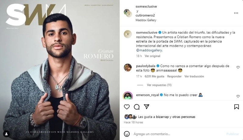 "Un artista nacido del triunfo, las dificultades y la resistencia. Presentamos a Cristian Romero como la nueva estrella de la portada de SWM, capturado en la potencia internacional del arte moderno y contemporáneo" dice la publicación conjunta de SWM y Cuti Romero en sus cuentas de Instagram, que rápidamente cosechó todo tipo de felicitaciones.