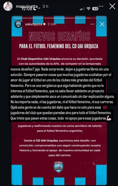 Por su parte, Magalí Natta, también exjugadora del club, denunció la falta de explicaciones y apoyo: “Dejan a jugadoras libres sin solución. Es una vergüenza que siga habiendo gente que no le interesa el fútbol femenino. No les importa nada, ni las jugadoras, ni el fútbol femenino, ni sus carreras”.