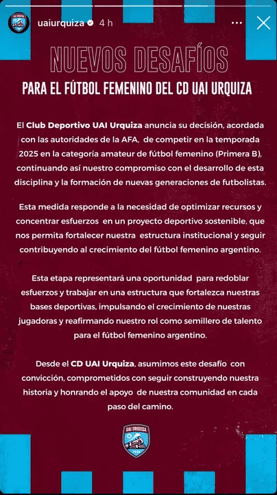 En su anuncio oficial, UAI Urquiza destacó que este cambio responde a la necesidad de “optimizar recursos y concentrar esfuerzos en un proyecto deportivo sostenible”. El club, que fue cuna de talentosas futbolistas que brillaron en la selección argentina, argumentó que su enfoque estará puesto en la formación de nuevas generaciones y el fortalecimiento de las bases institucionales.