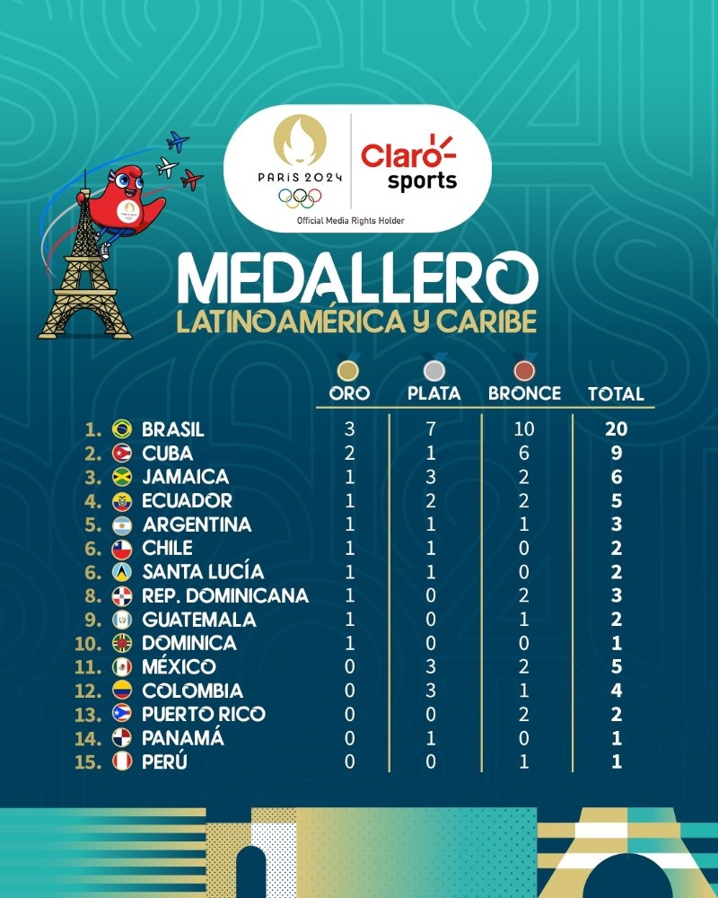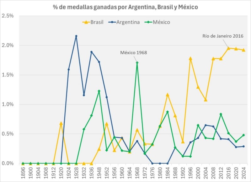 Brasil viene en ascenso y desde Río 16 orilla el 2% de las medallas. En tanto que México tuvo su mejor marca en México 68, y nunca más superó el 1% de las preseas totales.
