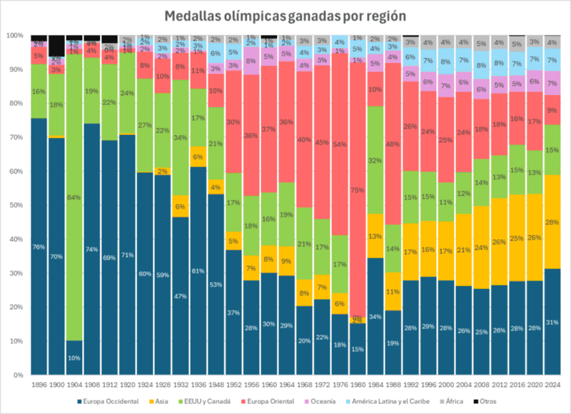 Tras los Juegos Olímpicos de París 2024, un informe muestra la evolución del desempeño de los países a lo largo del tiempo y también por regiones, con el quiebre que marcó el final de la Guerra Fría y la disolución de la Unión Soviética. Estados Unidos, el más ganador, obtiene el mismo porcentaje de medallas desde hace tres décadas, pero es seguido de cerca por China y Japón, los grandes impulsores junto a Corea del Sur del crecimiento asiático. El resumen lo elaboró Daniel Schteingart, curador del portal de datos Argendata