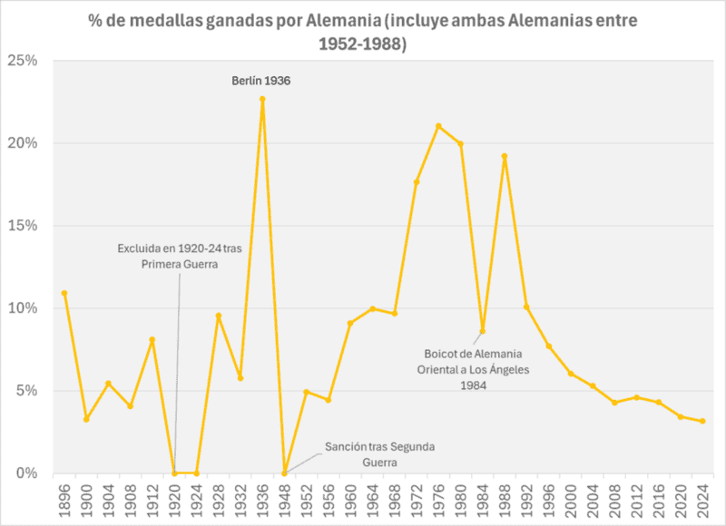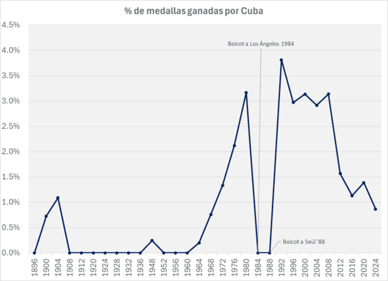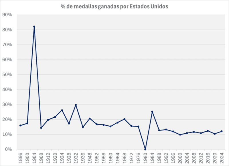 Estados Unidos lideró en París 2024 y se llevó el 12% de las medallas. En perspectiva, ese 12% está a tono con lo que viene ocurriendo desde hace 30 años. El pico de 1904 corresponde a los JJOO de Saint-Louis, con casi todos atletas de ese país. El 0% de 1980 es el boicot a los Juegos Olímpicos de Moscú, en plena Guerra Fría.