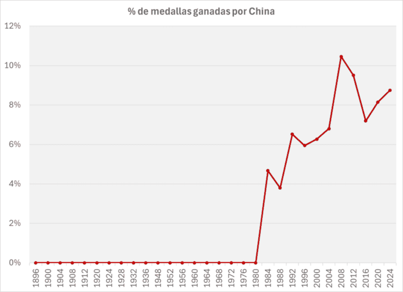 China salió segunda, con el 9% de las medallas. La tendencia al alza de los chinos es clarísima. Sin embargo, el pico lo tuvo en Beijing 2008: cuando fue local se llevó el 10% de las medallas. El desempeño de París 2024 es el tercero mejor, por detrás de 2008 y Londres 2012.