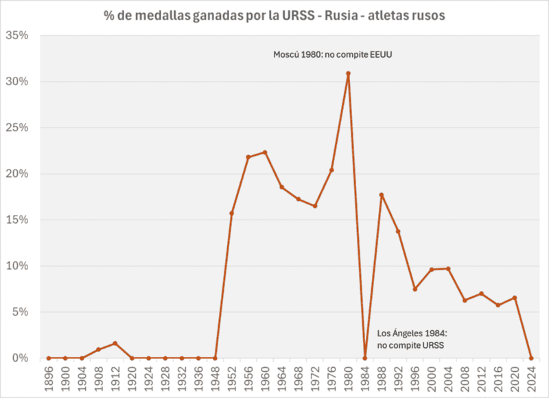 En París 24 no hubo medallas para los atletas rusos, que no pudieron competir por las sanciones al país por la invasión a Ucrania. En perspectiva histórica, el desempeño de la URSS-Rusia se ve así.