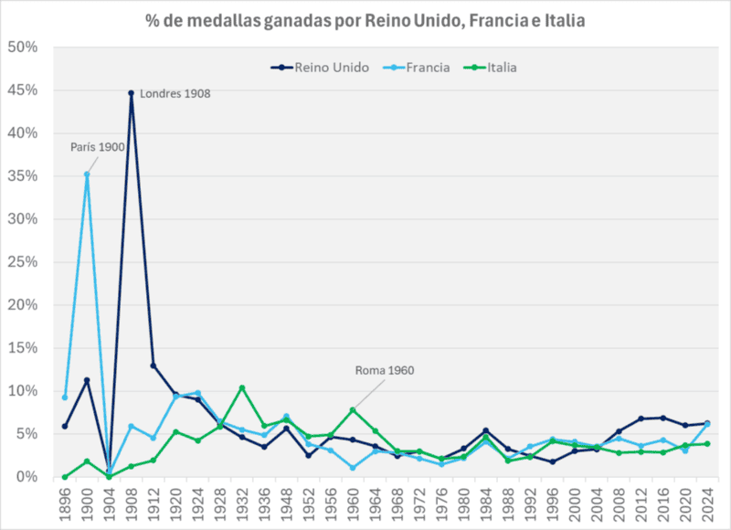 A diferencia de los alemanes, otras potencias europeas como Gran Bretaña, Francia e Italia mantienen hace décadas un similar porcentaje de las medallas conquistadas.