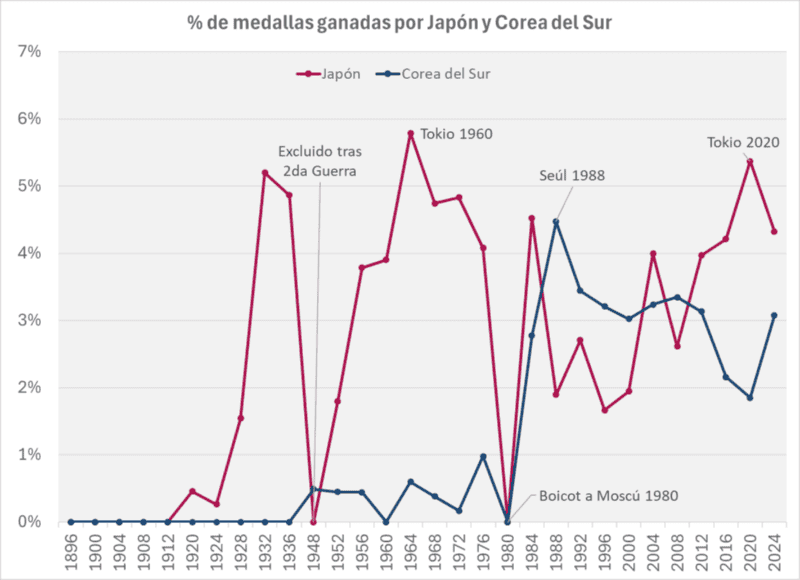 Por su parte, Corea del Sur despega en los 80 y tiene su mejor marca en Seúl 88, como anfitrión.