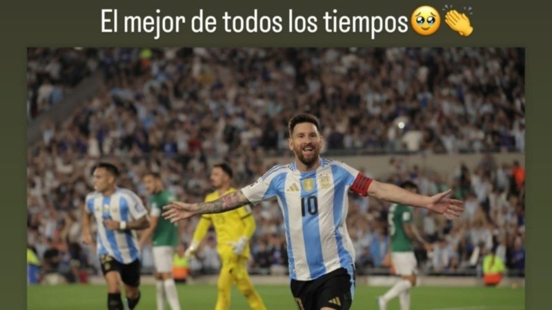 Tras la euforia por parte de la familia Messi en su primer gol, Antonela volvió a dejarle un sentido mensaje al rosarino una vez finalizado el partido y consumada su impactante actuación. “El mejor de todos los tiempos”, publicó la modelo con una foto de su esposo, acompañada por el emoji de aplausos y el de una cara con lágrimas en sus ojos.
