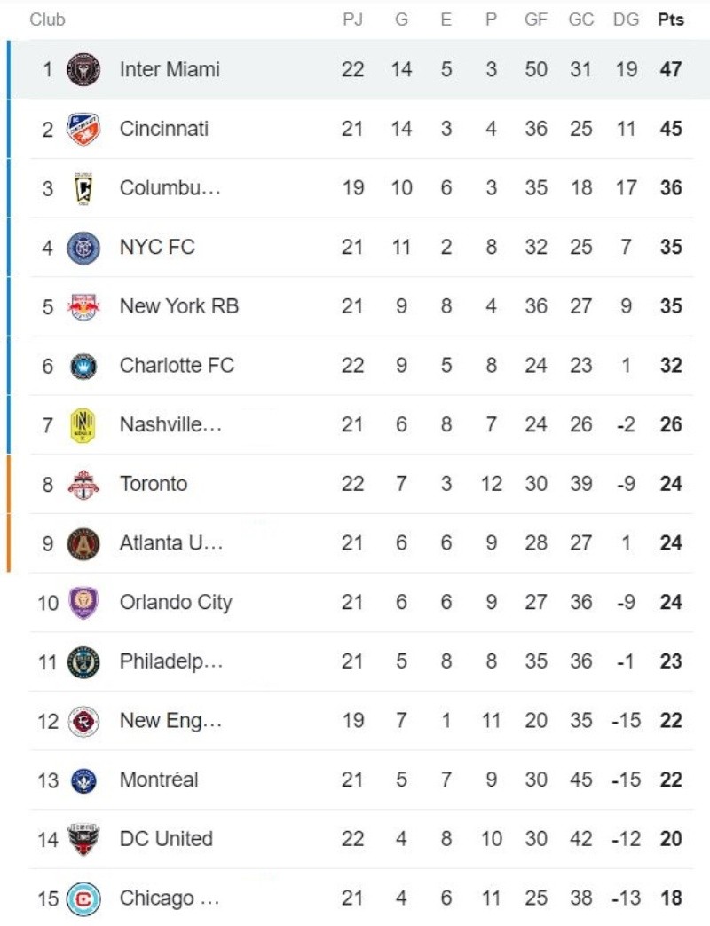 Inter Miami acumula 47 puntos en la tabla, dos más que Cincinatti, que tiene un partido menos y al que el sábado visitará por la próxima fecha, con la chance de poder sacarle más ventaja o, por el contrario, cederle el liderazgo.