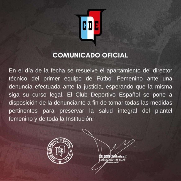 “En el día de la fecha se resuelve el apartamiento del director técnico del primer equipo de Fútbol Femenino ante una denuncia efectuada ante la Justicia, esperando que la misma siga su curso legal", fue el mensaje, firmado por el presidente Diego Martin Elías, que publicó el club en sus redes.
