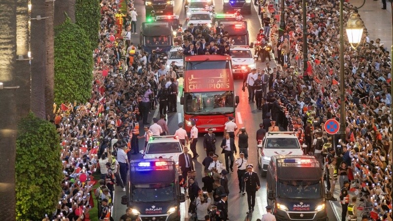 La multitud se volcó a las calles para recibir a los jugadores, quienes realizaron un paseo triunfal sobre un micro descapotable y ploteado especialmente. Los festejos reflejan la pasión con que se vive el fútbol en Marruecos y el significado de este inédito logro.