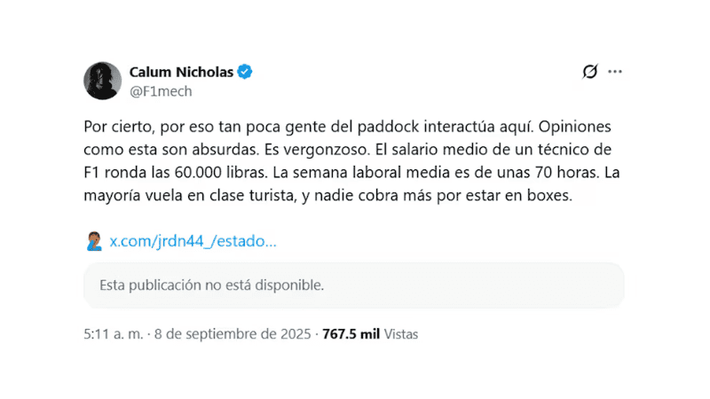“El salario promedio de un técnico de F1 ronda las 60.000 libras (unos 81.000 dólares)”, afirmó Nicholas en su cuenta de X, recordando su experiencia junto al multicampeón Max Verstappen.