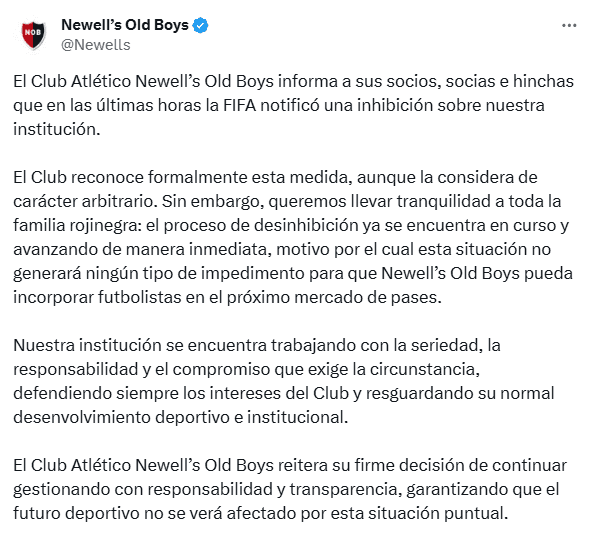 Algunas horas después de que se confirmará la noticia de que Newell’s había sido inhibido por FIFA, el club se expidió con un comunicado en sus redes sociales.