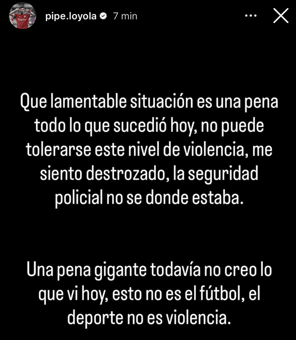 Las palabras de Loyola, que se lo vio preocupado dentro del campo de juego mientras buscaba a sus familiares, cobran un peso especial por su doble condición de jugador del equipo local y compatriota de la hinchada visitante, y se suman a las críticas generalizadas por las graves fallas en el operativo que permitieron la escalada de violencia.