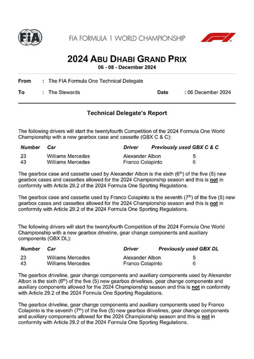Franco Colapinto y el tailandés Alex Albon, de Williams, deberán cumplir con una penalización impuesta por la FIA en la carrera del domingo del Gran Premio de Abu Dhabi.
