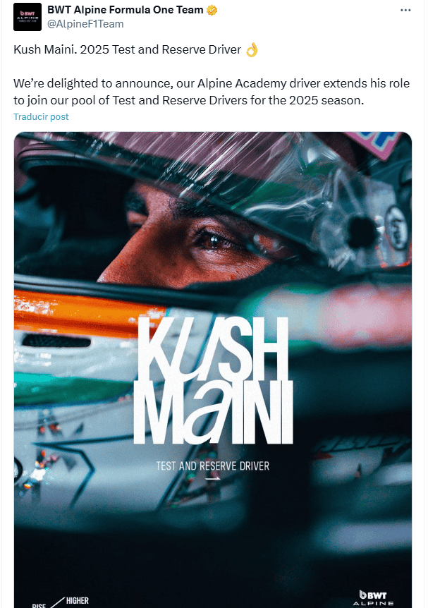 “El equipo de Fórmula Uno BWT Alpine se complace en anunciar que el piloto de la Academia Alpine Kush Maini se unirá al grupo de pilotos de pruebas y reserva del equipo para la temporada 2025. Como piloto de pruebas y reserva, las funciones de Kush consistirán en ofrecer un valioso apoyo a los objetivos de desarrollo y puesta a punto del coche del equipo utilizando el simulador de piloto de Enstone, así como participar en su programa TPC destinado a mejorar las habilidades al volante de un coche de Fórmula Uno contemporáneo y moderno”, publicó la escudería francesa a través de sus redes sociales.
